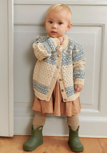 Koften strikkes nedenfra og opp. Først legges det opp masker til for- og bakstykket. Vrangborden strikkes frem og tilbake før det legges opp nye masker til oppklippsmasker midt foran. Videre strikkes arbeidet rundt. Koften strikkes med eller uten lus, før det strikkes mønster helt øverst. Til slutt klippes det opp midt foran og til hvert erme, før det strikkes forkanter, halskant og ermer. Veiledende pinner: Pinne nr 3 Strikkefasthet: 27 masker = 10 cm Tilbehør: (5) 5 (6) 6 (6) knapper Hjelmtvedt K312968