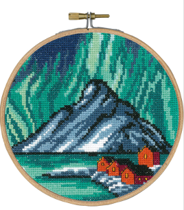 Med i pakken er det AIDA broderstoff, brodergarn og tilbehør som ringer og nål. Instruksmanual følger også med. 100% Bomull 35x56cm