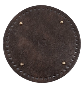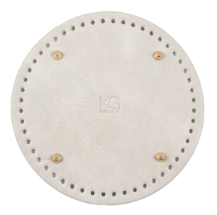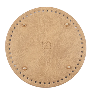Bunn i PU-skinn til å hekle eller sy på vesker og kurver. Stødig base med 4 gullfargede metallbein på undersiden. Bunnen har 52 små hull langs kanten. Nikkelfri. Størrelse: Ø200xH3.5mm Hull: 4,5mm
