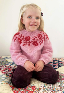 Rosie Yoke Sweater junior strikkes ovenfra, og roseborden strikkes inn i det runde bærestykket. Resten av blusen er helt enkel i glattstrikk og med ribbkanter i 2 tråder garn, Sunday og Tynn Silk Mohair. Informasjon om produktet Rosie Yoke Sweater junior er strikket ovenfra (halskanten strikkes til slutt). Først strikkes vendepinner (german short rows - GSR), for å forme halsutringningen. Det vil si at når vendepinnene strikkes, strikker man frem og tilbake i glattstrikk – altså rett på rettsiden og vrang på vrangsiden. Bortsett fra vendepinnene strikkes genseren utelukkende rundt. Det runde bærestykket formes med økninger. Både mønster og økninger er vist i diagrammet. Veiledende pinner: Pinne nr 4 Strikkefasthet: 28 masker = 10 cm