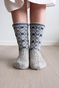 En variant av Regnbuesokken. Strikkes på pinne 4 i Embla – Hifa 3, 100 % ull og Fjell Sokkegarn 3, 80 % ull og 20% nylon. Garnpakken inneholder oppskrift og garn nok til to par sokker. --------------------- Pack including yarn and pattern to make two pairs of your own "mountain" socks. Pattern is in Norwegian and English.