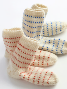 Dado prikkesokker er glattstrikkede sokker med små prikkestriper i kontrastfarge, strikket i det holdbare og pusete ullgarnet Vandre. Et fargerikt og sjarmerende par til både store og små! Sokken strikkes ovenfra og ned med vendepinner i hælen og klassisk tåfelling. Oppskriften kommer i størrelser til barn, dame og herre og er perfekte sokker til familien og som julegaver!