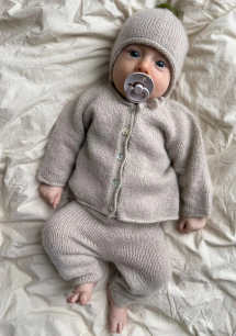 Cleo Baby Set består av lue, cardigan og bukser. Cardiganen strikkes ovenfra og ned med raglanøkninger. Cardiganen har glattstrikkede rullekanter. Det strikkes glattstrikkede knappestolper og etterfølgende en glattstrikket halskant. Lua strikkes fra toppen og ned på strømpepinne. Det strikkes øreklaffer, og deretter strikkes en rullekant rundt langs avfellingskanten. Til slutt strikkes knytebånd. Buksene strikkes ovenfra og ned. De strikkes høyere bak ved hjelp av vendepinner. Målskjema finner du her. Størrelser: 0-2 (2-4) 4-6 (6-9) 9-12 (12-18) 18-24 mnd. Mål: Cardigan: Overvidde: 49 (51) 54 (56) 58 (60) 62 cm; lengde: 23 (25) 27 (29) 31 (33) 35 cm Bukser: Livvidde: 42 (44) 46 (48) 50 (51) 53 cm; benlengde: 15 (17) 20 (23) 25 (27) 29 cm Strikkefasthet: 23 masker x 36 pinner i glattstrikk på pinne 3,5 mm = 10 x 10 cm Veiledende pinner: Rundpinne 3,5 mm (40 og 60 cm), rundpinne 3 mm (40 og 60 cm), strømpepinner 3,5 mm Materialer: Cardigan: ca. 50 (60) 70 (78) 86 (93) 100 g Cashmere fra Sandnes Garn (25 g = 112 m) eller ca. 105 (125) 145 (162) 178 (194) 208 g Double Sunday fra Sandnes Garn (50 g = 108 m) Bukser: ca. 42 (48) 54 (60) 66 (71) 76 g Cashmere fra Sandnes Garn (25 g = 112 m) eller ca. 86 (100) 113 (125) 137 (148) 158 g Double Sunday fra Sandnes Garn (50 g = 108 m) til bunnfargen og ca. 5-10 g Cashmere fra Sandnes Garn (25 g = 112 m) eller ca. 10-15 g Double Sunday fra Sandnes Garn (50 g = 108 m) til innside av linning Lue: ca. 15 (17) 18 (19) 21 (23) 25 g Cashmere fra Sandnes Garn (25 g = 112 m) eller ca. 32 (36) 38 (40) 44 (48) 52 g Double Sunday fra Sandnes Garn (50 g = 108 m) og ca. 10-15 g Cashmere fra Sandnes Garn (25 g = 112 m) eller ca. 20-25 g Double Sunday fra Sandnes Garn (50 g = 108 m) til dusk 7 (7) 8 (8) 8 (8) 8 knapper (Ø = 11-12 mm), myk bukseelastikk (2 cm bred) Vanskelighetsgrad: ? ? ? (3 av 5)