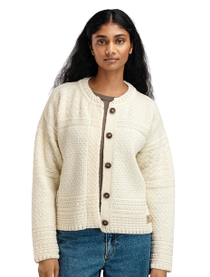 Lusa er en cardigan med skjult knepping og en avslappet passform. Vakker strukturstrikk gir den en enkel, men stilfull eleganse. Lusa har den perfekte lengden til å styles med dine favorittjeans. Designet er inspirert av de ikoniske håndstrikkede genserne som ble brukt av fiskere på 1800-tallet og tidlig 1900-tall. Lusa er strikket i ensfarget norsk ull, men skiller seg likevel ut med intrikate detaljer. Det distinkte og tidløse strukturmønsteret er hentet fra det klassiske "Setesdal"-designet, også kjent som lusekofta. XS – XL Passform: regular Utførelse: tykt strikket 100% fin norsk ull (Njord 30,5 mikron) Hals fôret med myk merino-ull 3-ply 5 gauge 720g (størrelse M) T-sleeve Knapper laget av 50% resirkulert papir. Rund hals (crew neck) Designet og strikket i Norge Kan vaskes i maskin på ullprogram