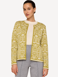 Mellomlang jakke med en klassisk passform og rund hals. Inspirasjonen til denne kolleksjonen er først og fremst blomsten julerose. Jakken har en lett strukturstrikk som fremhever mønsteret. En klassisk jakke som lett kan kombineres med våre strikkede topper eller en fin silkebluse. ------------------- Mid-length cardigan with a classic fit and round neck. Inspired by the flower Helleborus. Brightly coloured flowers and subtle bobble details at the shoulders give this classic cardigan a playful twist. 75% Merinoull 25% Silke Made in Norway.