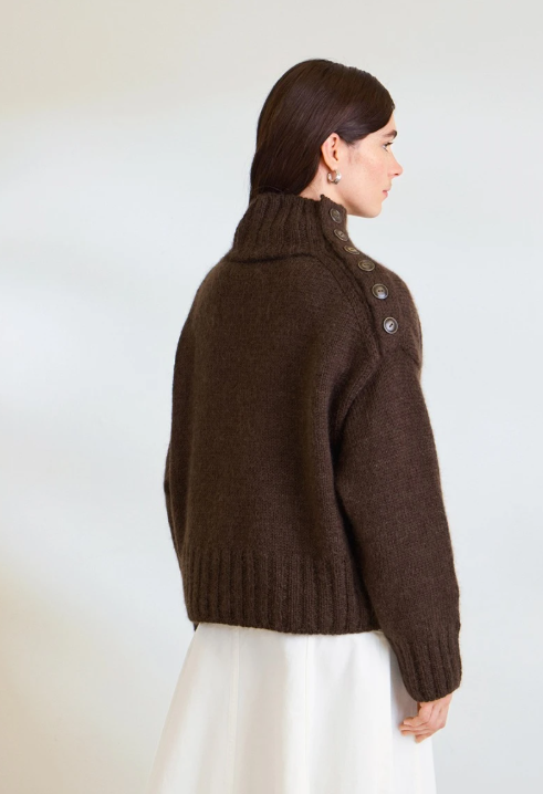 Genser strikket ovenfra og ned med én tråd Peer Gynt kombinert med Tynn Silk Mohair. Dekorativ knappedetalj langs skulder og hals, glattstrikkede ermer og vrangbordavslutning.