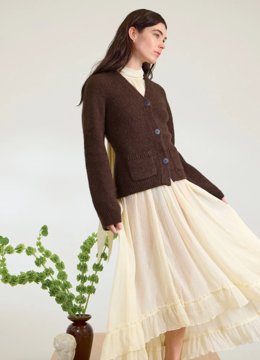 Cardigan strikket ovenfra og ned med én tråd Alpakka Ull og én tråd Tynn Silk Mohair. V-hals, formet liv, glattstrikkede ermer og dobbelstrikket forkant med påsydde lommer.