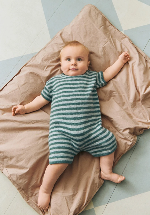 Romperen strikkes ovenfra og ned i stripemønster. Først strikkes bakstykket frem og tilbake med vendepinner for å danne skrå skuldre, og videre ned til under ermene. Hver side av forstykket strikkes for seg med vendepinner og økninger til hals, før forstykket samles og det strikkes ned til under ermene. For- og bakstykket samles og strikkes rundt, før arbeidet deles til ben. Bena strikkes frem og tilbake, slik at det dannes åpning mellom bena som lukkes med trykknapper. Tilslutt strikkes det opp masker til ermer og til halskant.