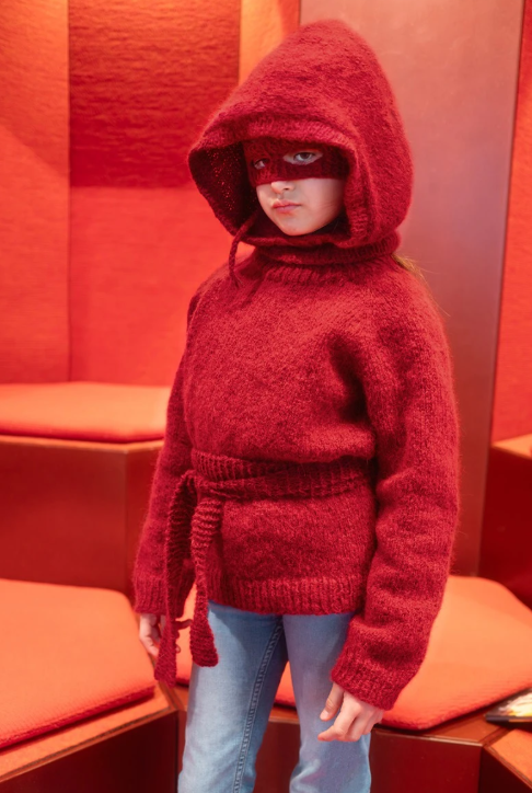 Maske og beltet: Det legges opp masker, og masken strikkes frem og tilbake i rillestrikk til hull for øynene. For å forme øyehull, deles arbeidet i to, og det strikkes to remser hver for seg med fellinger og økninger. Når de to øyehullene er strikket, strikkes masken videre frem og tilbake i rillestrikk til hel lengde. Til slutt flettes det snorer som festes i hver side av masken. Beltet strikkes frem og tilbake i rillestrikk til ønsket lengde. Vi har strikket det langt sånn at det henger ned på siden etter at man har knytet det i livet.