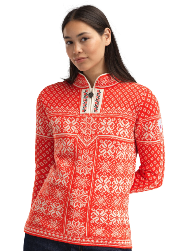 En tradisjonell og feminin ullgenser i 100% ull med lang holdbarhet, kjent for sin svært holdbare kvalitet. Genseren ble opprinnelig designet til vinter-OL i Torino i 2006. Peace har broderimønstre, et lite tinnhjerte som glidelåstrekker og tinnknapper på ermene. En tidløs klassiker.