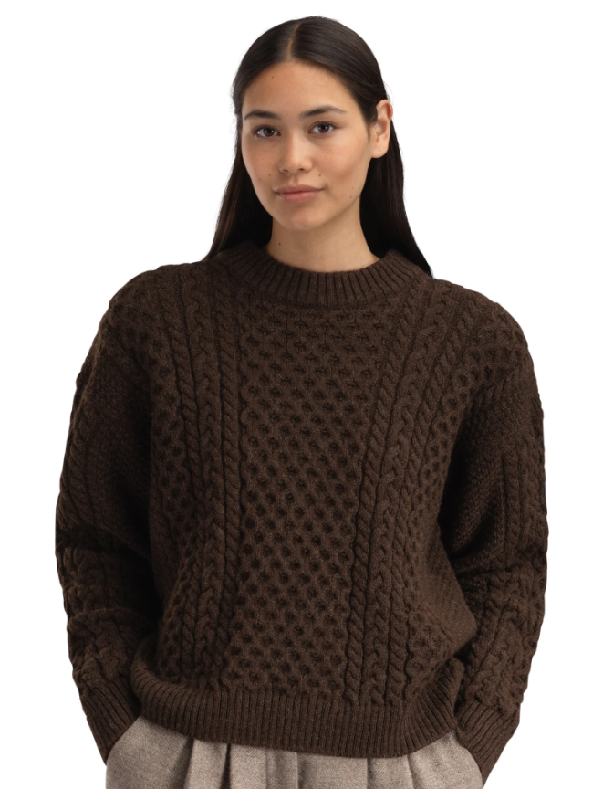 Stalheim er en varm og lun genser i 100% ull, der strukturen alene står for det visuelle uttrykket. Kabelstrikk, perlestrikk og bikubemønstre bygger dybde i en tykt strikket ullgenser med avslappet silhuett. Ribbestrikket hals, ermekanter og nederkant gir en ren innramming som lar den rike teksturen stå i fokus. En uanstrengt nytolkning av den klassiske irske Aran-genseren. Tidløs, men ikke nostalgisk.
