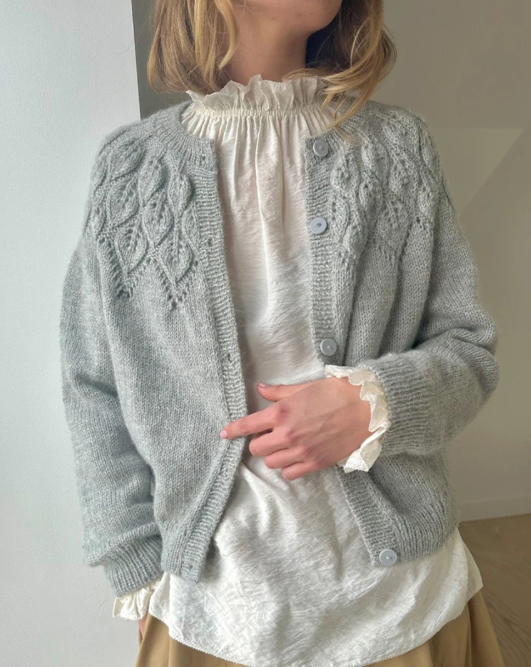 Ella Cardigan strikkes ovenfra. Først strikkes vendepinner, som gjør halsutringningen dypere foran enn bak. Deretter strikkes det runde bærestykke med mønster etter diagram, og til slutt strikkes bol og ermer ferdig for seg i glattstrikk. Til slutt strikkes forkanter og halskant, og det sys i knapper.