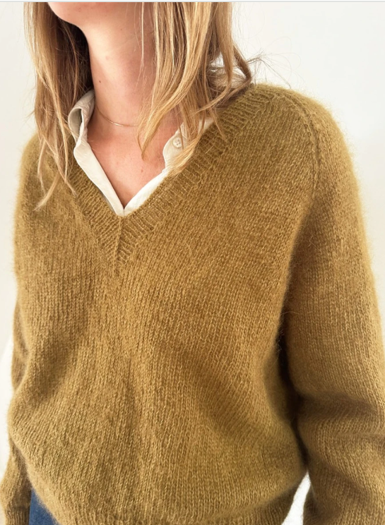 Vega har V-hals og en raglanfasong som er ekstra fin, fordi det økes forskjellig på ermer og for-/bakstykke. Strikket med 2 tråder Tynn Silk Mohair.