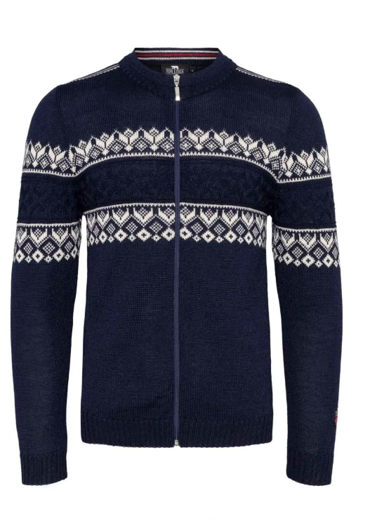 Tønsberg cardiganen har et klassisk norsk mønster med geometriske former og en fin, taktil struktur. Den er strikket i 100 % ull, som gir naturlig varme, god pusteevne og lang levetid.