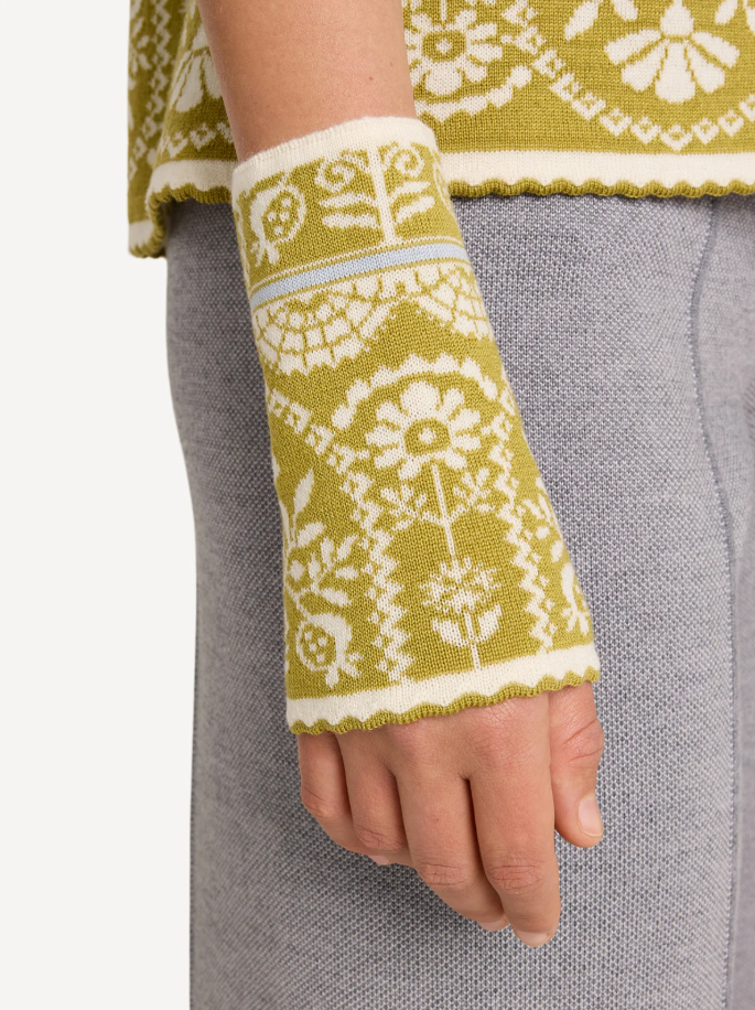 Oddrun pulsvarmere er strikket i vår signaturblanding av merinoull og silke, med et ornamentalt mønster hentet fra Oleanas arkiv – først lansert i 2005 og nå oppdatert i nye farger. De gir lunhet og karakter til antrekket, og passer perfekt sammen med Oddrun cardigan og skjerf. Laget i Norge, med omtanke og tradisjon i hver maske.