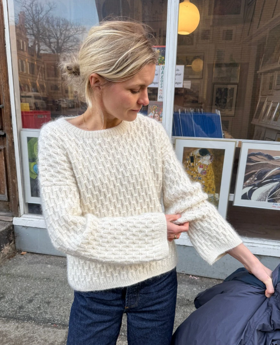 Materialer: 350 (400) 400 (400-450) 450 (450) 500 (500) 550 (550) g Sunday fra Sandnes Garn (50 g = 235 m) strikket sammen med 200 (200) 225 (225) 225-250 (250) 250 (275) 275 (300) g Primo Tynn Silk Mohair fra Sandnes Garn (25 g = 210 m)