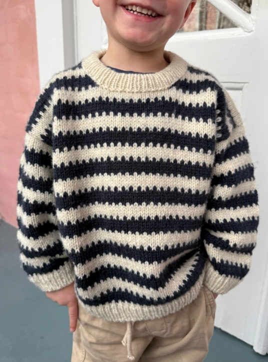Otto Sweater Junior strikkes ovenfra og ned i et stripemønster. Først strikkes bakstykket. deretter strikkes skuldrene hver for seg frem og tilbake på rundpinne. Disse samles foran for å danne forstykke. Videre samles forstykke og bakstykke for å danne bolen som strikkes rundt på rundpinne. Ermene strikkes ut fra opplukkede masker langs ermeåpningen. Halsens brettede halskant strikkes til slutt ut fra opplukkede masker.