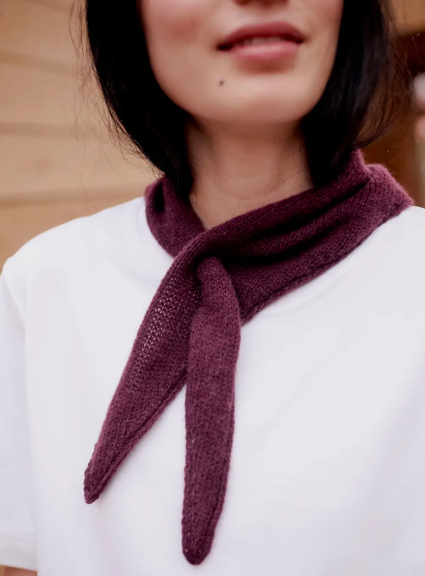 Lunt Magdatørkle er et delikat, glattstrikket trekanttørkle med en karakteristisk hull-lukking som gjør at det ligger pent rundt halsen uten behov for knyting. Tørkleet strikkes frem og tilbake fra spiss til spiss, med økninger og fellinger som gir en ren og symmetrisk form. Det kommer i to størrelser, begge designet for å gi maksimal effekt med minimal garnmengde – raske å strikke og nærmest som et lite smykke.