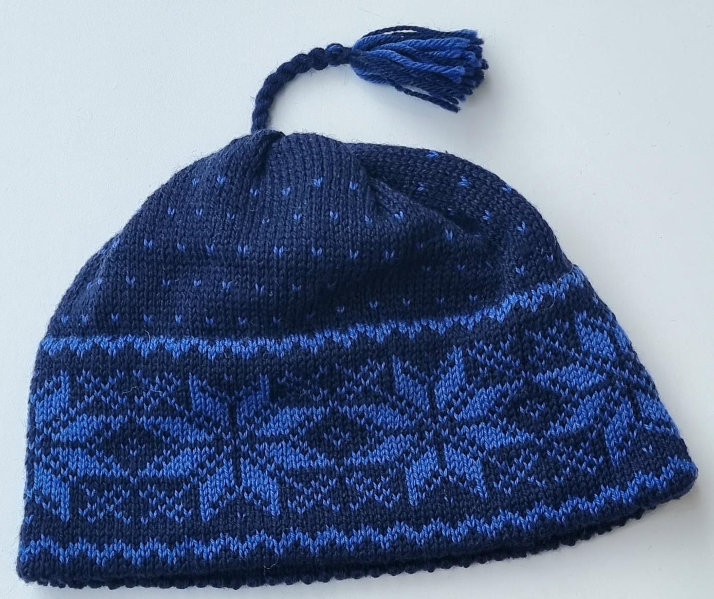 Topplue med merinoull inni. Varm og god, kan vaskes i maskinen på ullprogram.