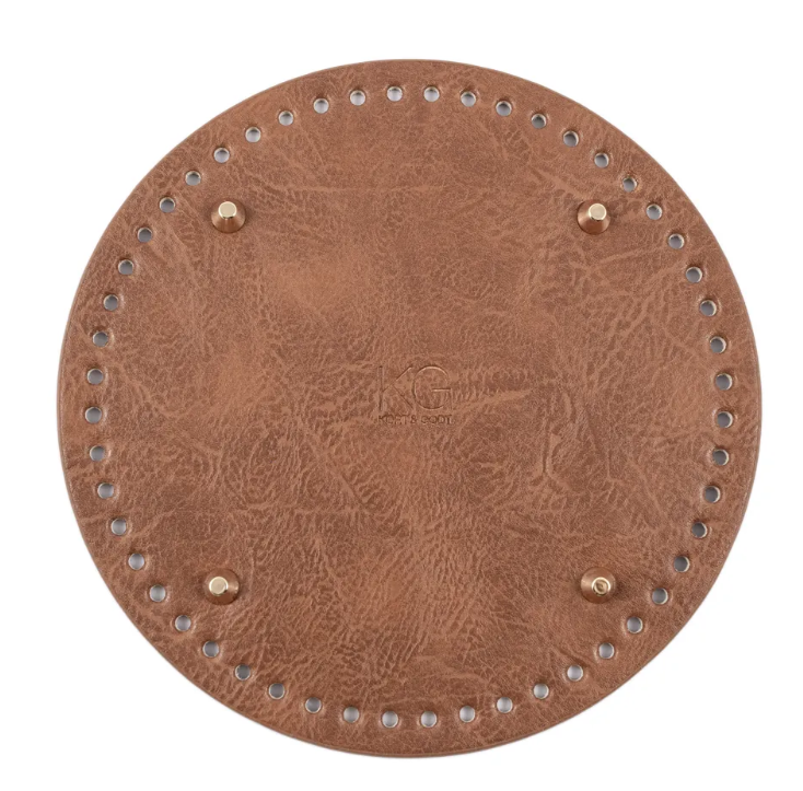 Bunn i PU-skinn til å hekle eller sy på vesker og kurver. Stødig base med 4 gullfargede metallbein på undersiden. Bunnen har 52 små hull langs kanten. Nikkelfri.