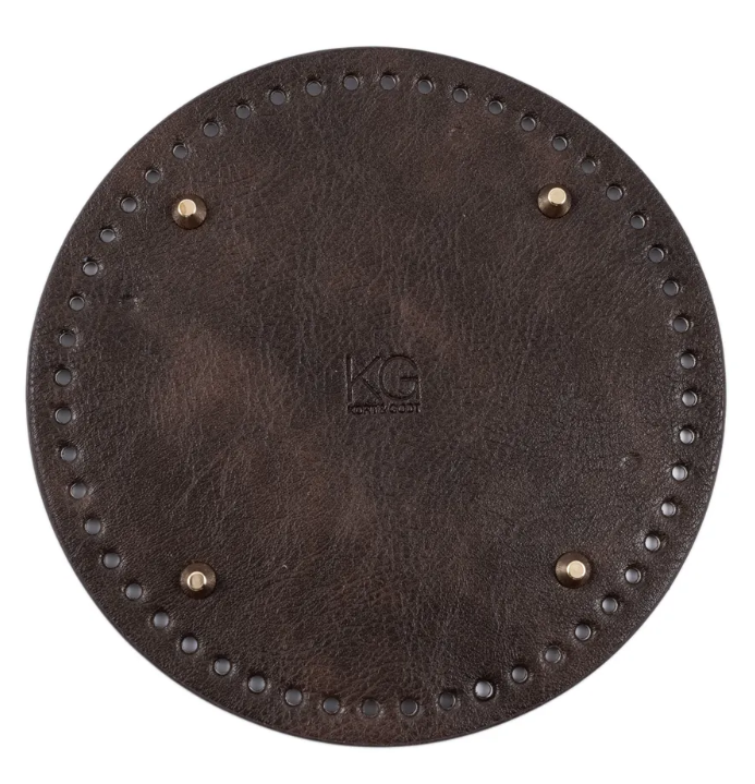 Bunn i PU-skinn til å hekle eller sy på vesker og kurver. Stødig base med 4 gullfargede metallbein på undersiden. Bunnen har 52 små hull langs kanten. Nikkelfri.