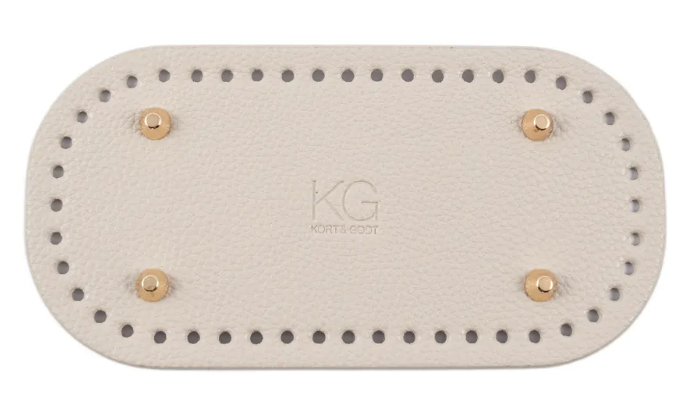 Bunn i PU-skinn til å hekle eller sy på vesker og kurver. Stødig base med 4 gullfargede metallbein på undersiden. Bunnen har 48 små hull langs kanten. Nikkelfri.